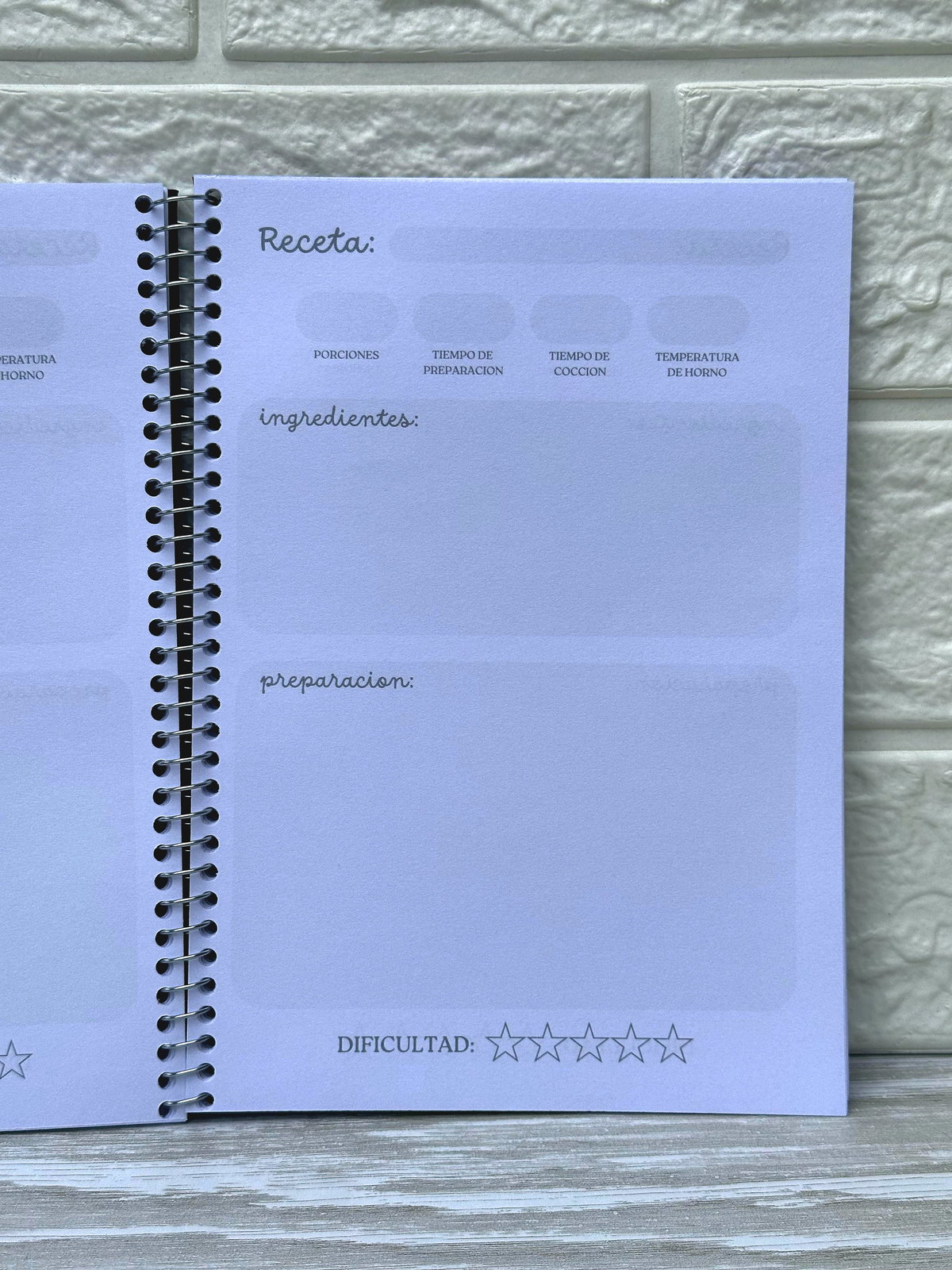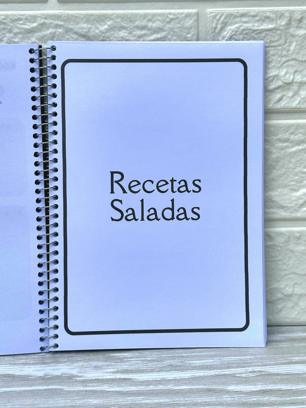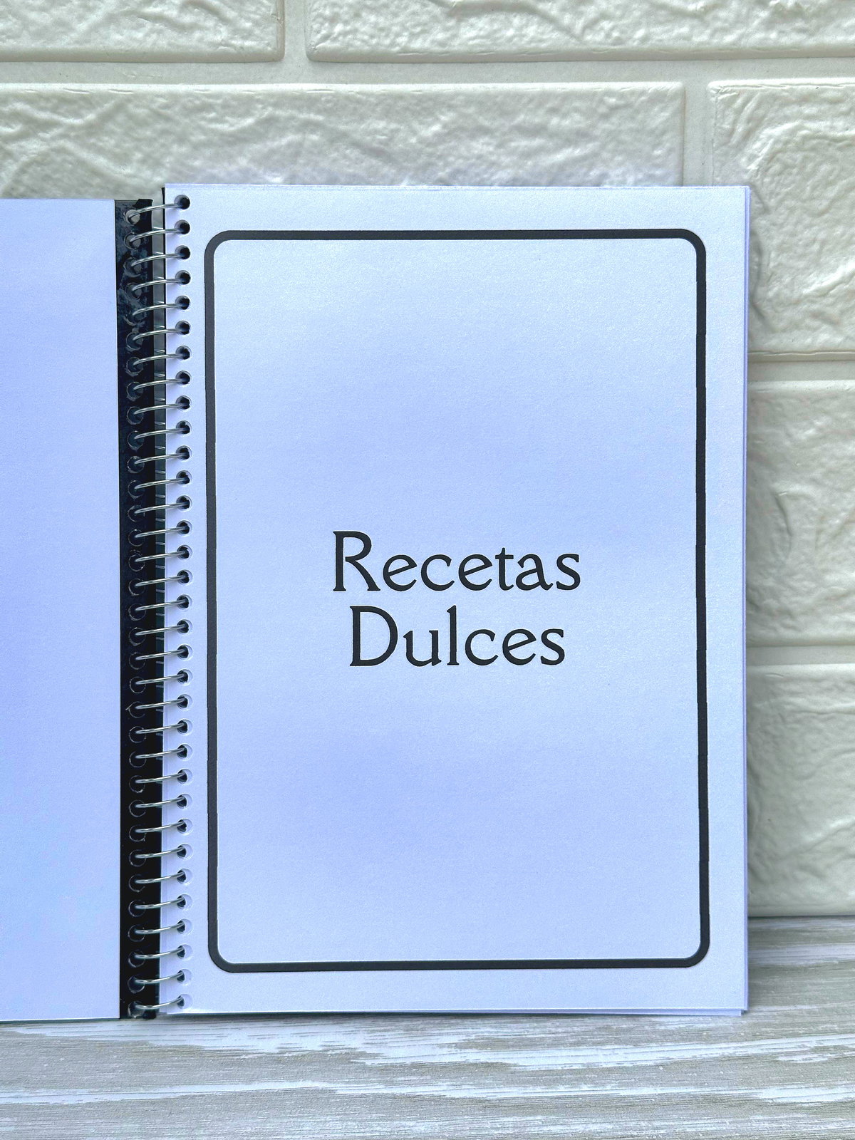 Tapa dura laminada, contiene en su interior 50 hojas con 2 divisiones de recetas dulces y recetas saladas. Incluye elástico para cerrar y esquineros metalicos.